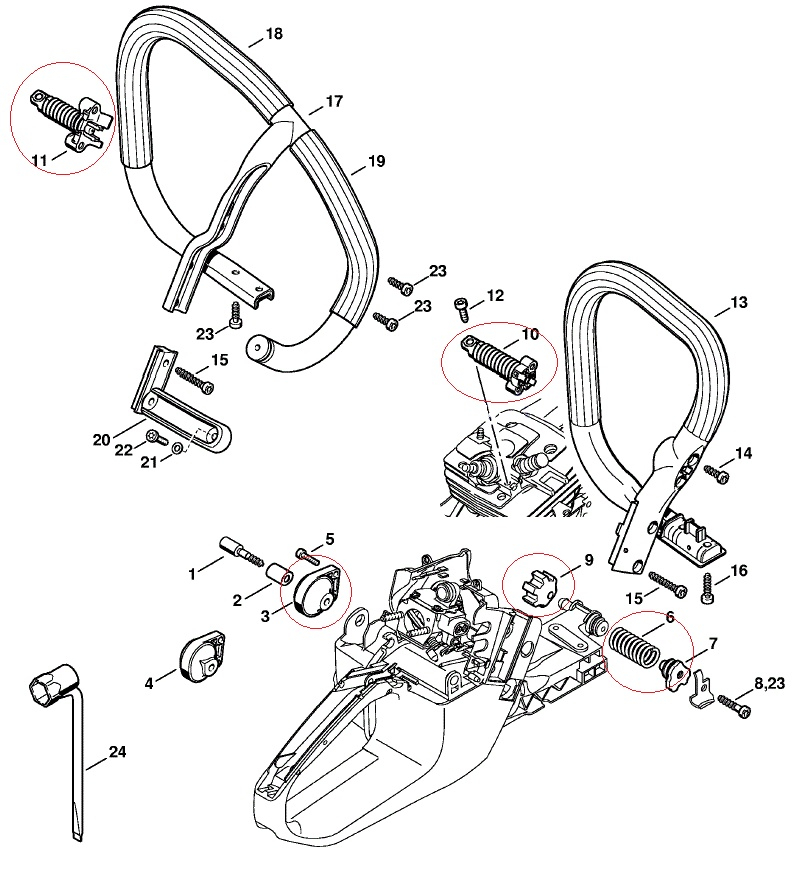 Set amortizoare drujba compatibil pentru modelele Stihl MS 341, MS 361. Coduri OPEM: 1135 790 8300, 1135 791 3100, 1135 790 9902, 1135 791 2800 Setul contine toate piesele din imagine. Made in China