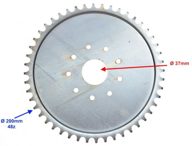 Fulie kit motor bicicleta. Aceasta fulie este compatibila pentru motorizari cuprinse intre 50cc, 60 cc, 80 cc. Dimensiuni: Numar dinti: 48 Dinti Diametru ax interior 37mm Diametru exterior: 195mm *Pentru alte dimensiuni va rugam sa consultati imaginea produsului Mai jos puteti vedea la ce kit se potriveste aceasta fulie :